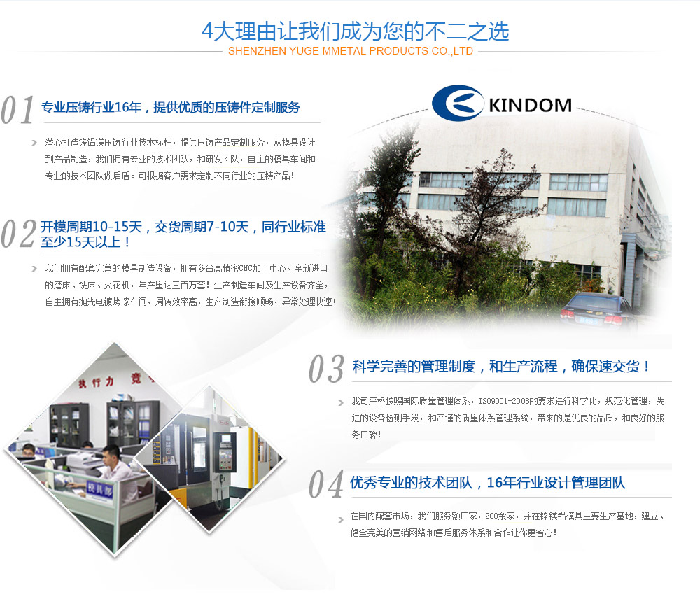 公司坐落在美麗的觀潮勝地海寧連行經濟開發(fā)區(qū)內,距杭州18公里,緊靠杭州繞城高速(G2501)下沙出口,距江東汽車產業(yè)園10公里。公司占地面積33000平方米,廠房建筑面積15050平方米。擁有各種高低噸位的著名品牌壓鑄件15臺(其中800T壓鑄機2臺、500T壓鑄機2臺、280T壓鑄機5臺、135T壓鑄機6臺),還有高精密自動沖床、高精密度多軸鉆床、切邊機、表面處理等設備20余臺。公司擁有三坐標測量儀、光譜分析儀、硬度拉力試驗機等精密計量檢測設備。